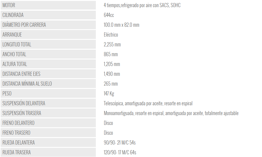 motor tipo: refrigerada por aire 589 cc SOHC 1-cilindro, 4 válvulas. 44 hp (32 kW)/ 6,500 rpm, 49,5 Nm (5,04 kg-m)/ 5,000 rpm.